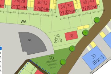 Die Bebauung ist gemäß Bebauungsplan mit einem Ein- bis Zweifamilienhaus zulässig. Für das Erdgeschoss ist jedoch eine gewerbliche Nutzung vorgeschrieben.